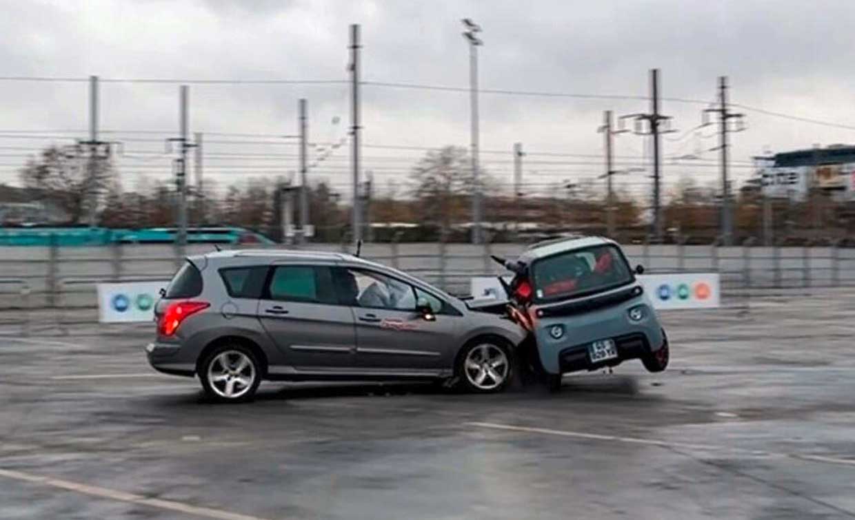 Avec pour objectif de sensibiliser aux dangers des voitures sans permis, le crash-test organisé par l’assureur MMA a simulé un accident à bord d’une Citroën AMI. Dans le cadre du test, la petite auto a été percutée latéralement par une Peugeot 308 break arrivant à 60 km/h. À bord du quadricycle, deux mannequins adolescents, non attachés.