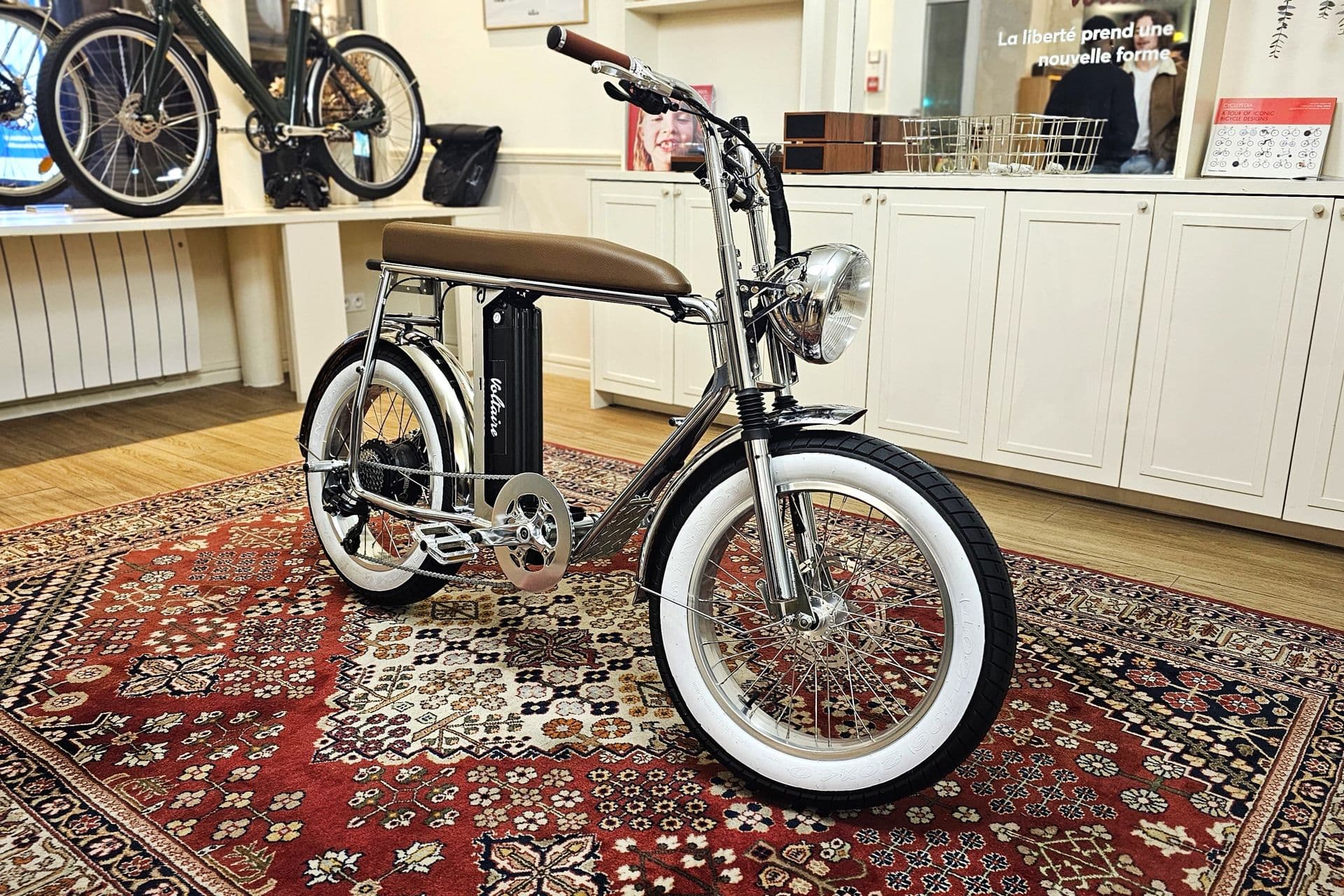 Ce dernier sert de base au Voltaire Paname, mais avec plusieurs évolutions. « Nous avons obtenu quelques libertés de personnalisation, notamment sur le traitement du cadre et de certains composants », précise la marque française. La patte Voltaire saute immédiatement aux yeux, dans la lignée du dernier Rivoli, avec une présence généreuse du chrome, particulièrement visible sur le modèle exposé dans la boutique du Marais. Si les garde-boue, le pédalier, la fourche et le phare conservent cet aspect brillant, le cadre peut quant à lui recevoir un coloris noir ou vert amande.