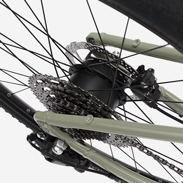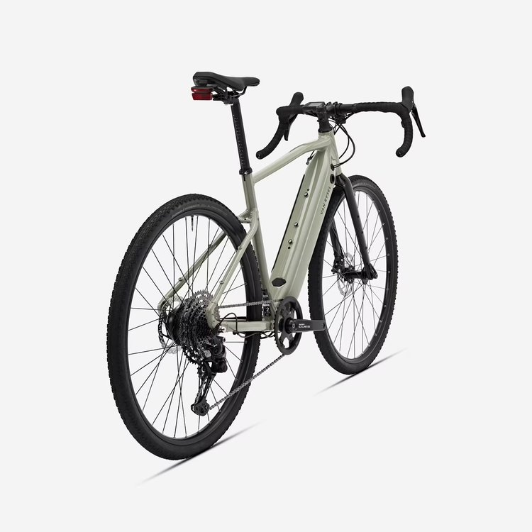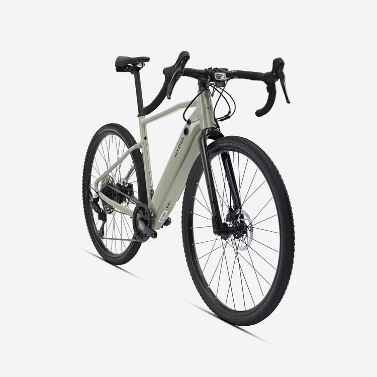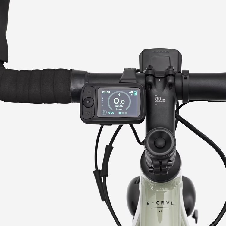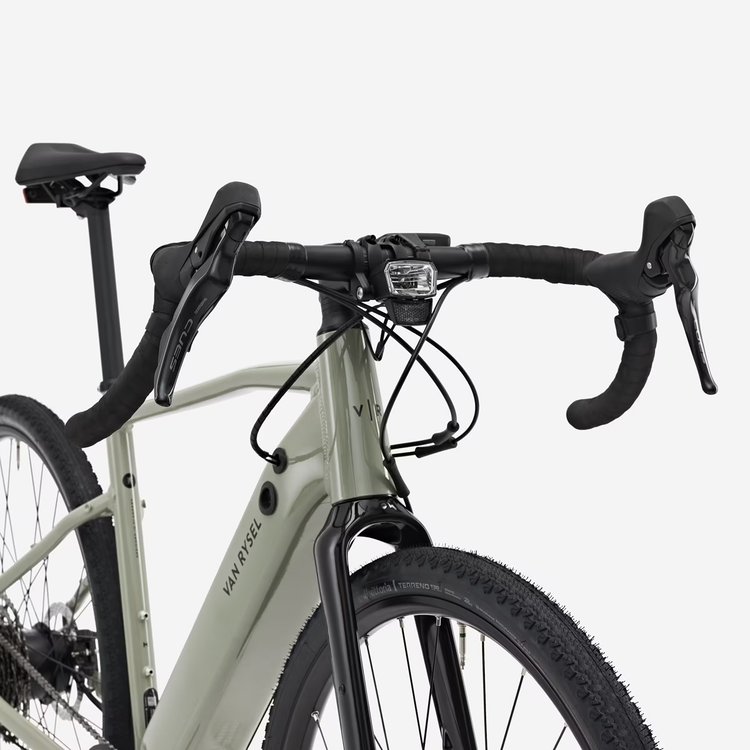 Ce gravel électrique se veut aussi prêt à l’aventure : inserts pour porte-bagages, sacoches et garde-boue, éclairage avant et arrière alimenté par la batterie, pneus Vittoria Terreno T30 en 700×45 mm qui devraient assurer confort et adhérence sur route comme sur pistes roulantes, position d’endurance confortable et selle Decathlon Confort 155 mm. Une conception pensée pour les trajets urbains, les sorties gravel du week-end et les escapades bikepacking.