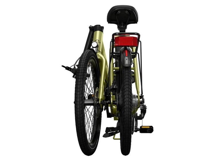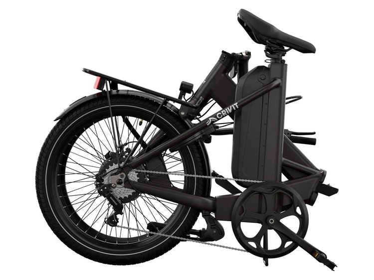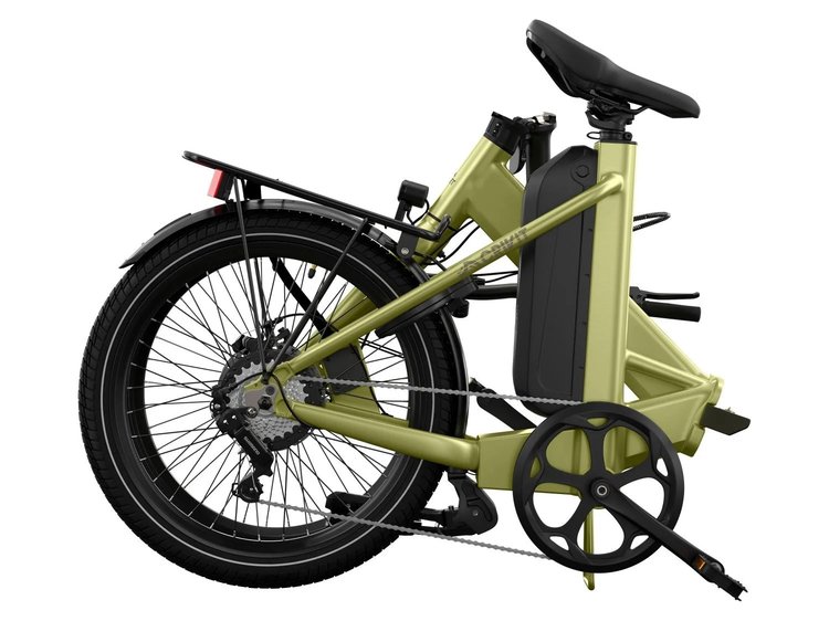 Ce premier vélo électrique pliant Crivit se distingue par son cadre anguleux en aluminium, proposé en vert ou noir. Son pliage rapide, selon Lidl, permet de le transporter ou de le ranger facilement, tandis que sa conception s’adapte à des cyclistes mesurant entre 1,60 m et 1,95 m. La batterie de 530 Wh, logée sans réelle intégration derrière le tube de selle, a toutefois l’avantage d’être amovible pour faciliter la recharge.