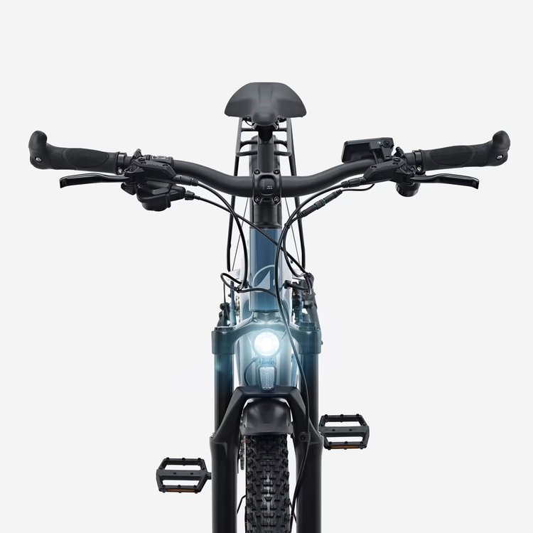 Le freinage hydraulique Tektro HD-M 275 à deux pistons agit sur des disques de 180 mm à l’avant et à l’arrière. Cette configuration assure un freinage progressif et efficace, adapté à un usage mixte route et chemin. La selle Rockrider Ergofit et la tige de selle en aluminium de 31,6 mm complètent l’équipement pour le confort. Le vélo intègre également un éclairage avant et arrière alimenté par la batterie principale, ainsi qu’un porte-bagages arrière pour transporter jusqu’à 25 kg de charge.