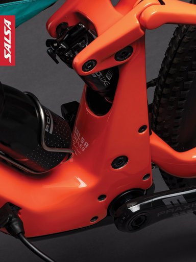 Cette architecture permet de réduire le poids et la complexité mécanique tout en intégrant des étriers de frein à disque plat-mount à l’intérieur du triangle arrière. Le débattement arrière peut être réduit à 100 mm en ajustant la course de l’amortisseur de 45 mm à 40 mm.