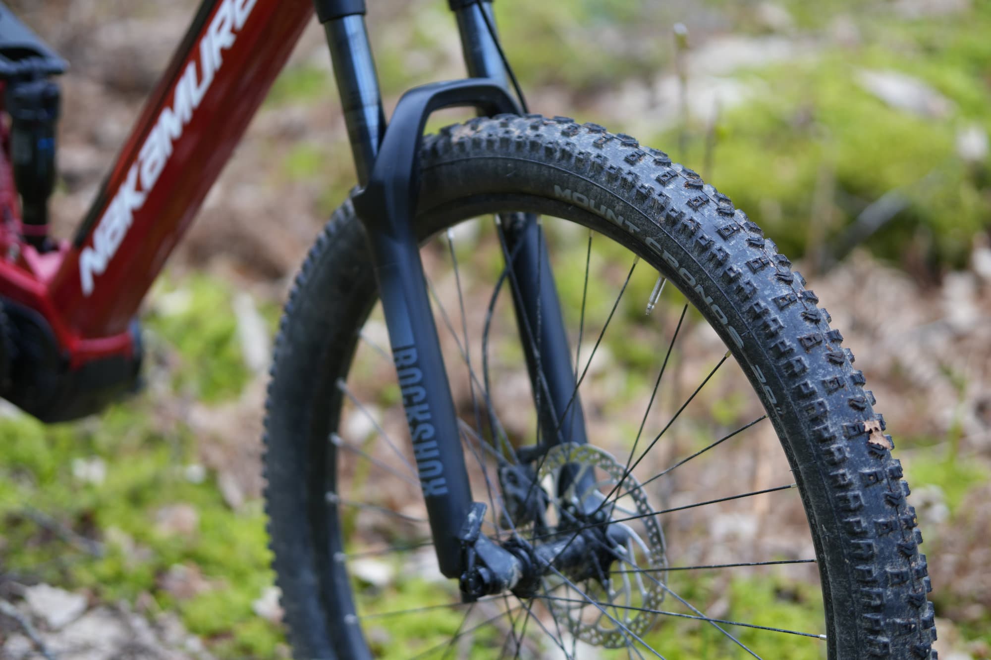 On ne peut dire pour autant que l’E-Summit 950 S soit le plus dynamique des VTT électriques. Il est, en effet, pénalisé par son poids et ses roues 29” d’entrée de gamme ne font pas de miracle. Surtout avec les pneus choisis par Nakamura. De marque Arisun et de section 2,35”, ils manquent franchement d’adhérence sur terrains humides. On en changera donc au plus vite, profitant de l’occasion pour passer à un montage tubeless, des fonds de jantes étant prévus à cet effet.