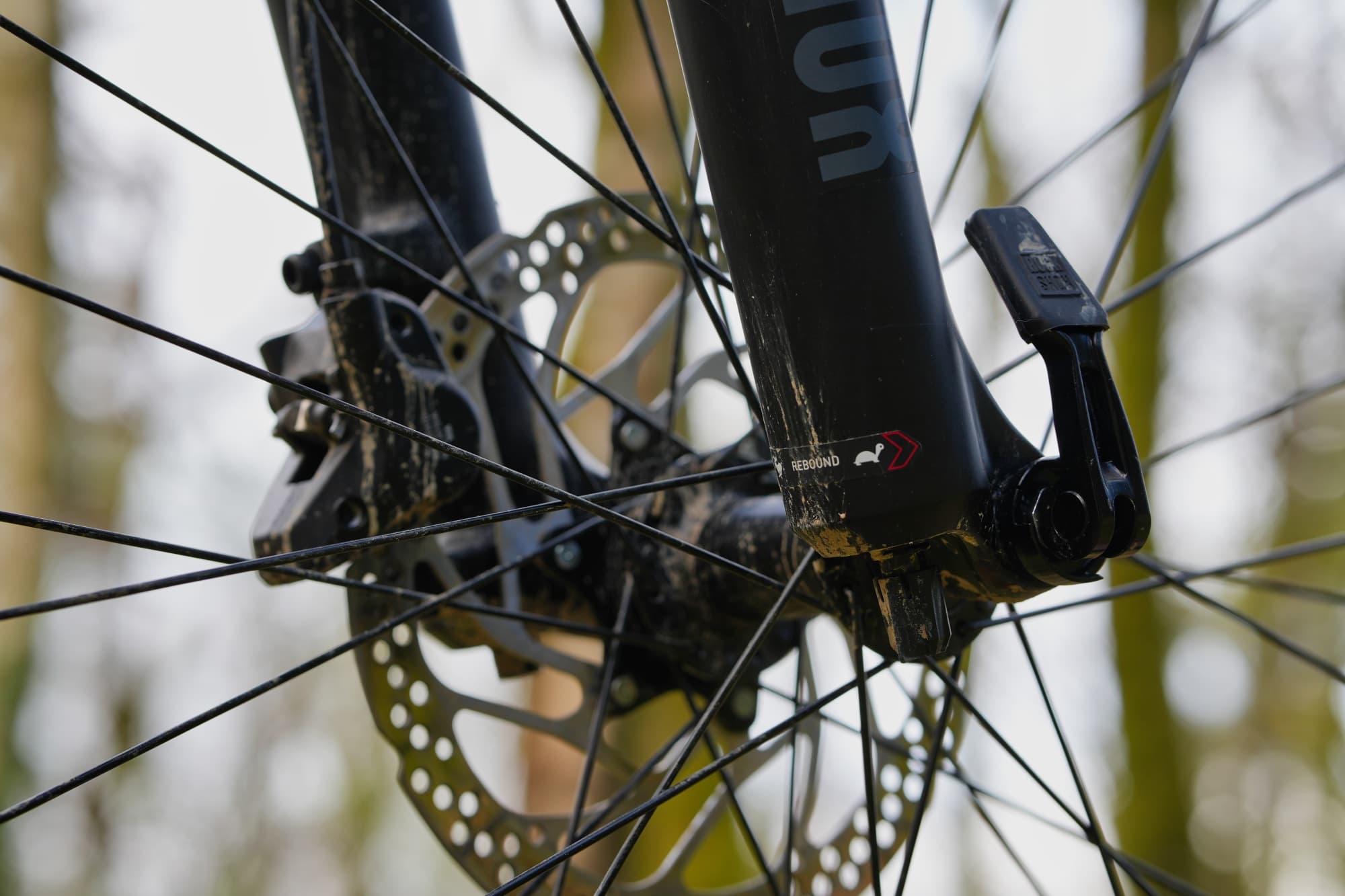 À l’arrière, c’est un amortisseur à air Rockshox Deluxe Select+ au débattement de 130 mm qui officie. Son réglage est simple, il suffit de le gonfler à la pression indiquée par le fabricant en fonction de notre poids. Celle-ci peut être trouvée via l’app RockShox TrailHead ou dans la documentation technique de la fourche. Il aurait été pratique de pouvoir consulter les recommandations de base directement sur la fourche, comme cela se fait sur certains modèles depuis un simple autocollant. Il faut pour cela utiliser une pompe haute pression spécifique (voir ci-dessous notre sélection de pompes hautes pression pour fourche et amortisseur).