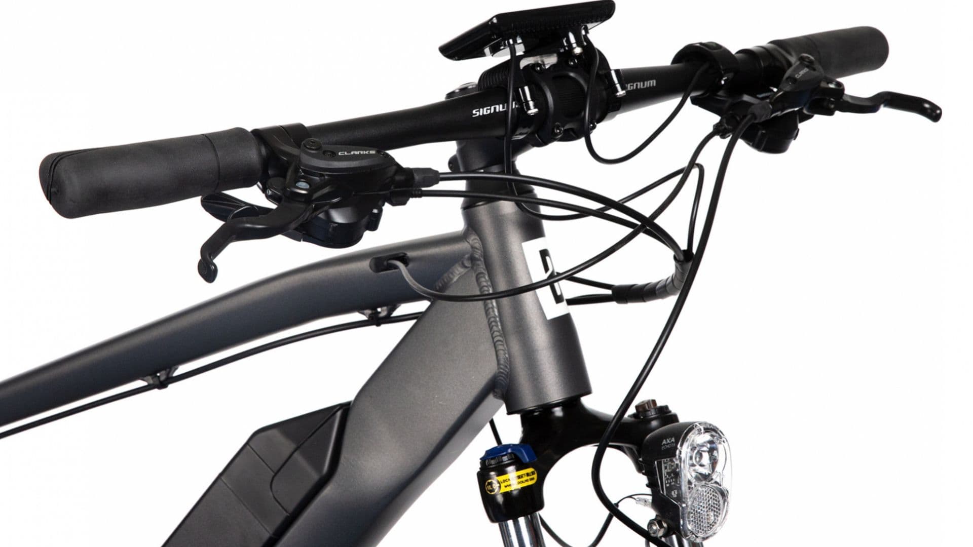 En ce qui concerne les composants, la tige de selle, tout comme la selle, sont de la marque Signum, fabriquées en alliage d’aluminium et mesurant 27.2 x 300 mm. Le système de transmission est composé d’une cassette Shimano Tourney TZ21 avec une plage de 14 à 28 dents. Le pédalier, de la marque Signum, est également en aluminium et est équipé de trois plateaux de 24, 34 et 42 dents avec une longueur de manivelle de 170 mm. Pour la partie freinage, le vélo est équipé de freins à disque hydrauliques Shimano BR-MT200 avec des rotors de 160 mm à l’avant comme à l’arrière. Enfin, les roues sont de marque Signum, construites en aluminium avec 36 rayons, et mesurant 700 mm de diamètre.