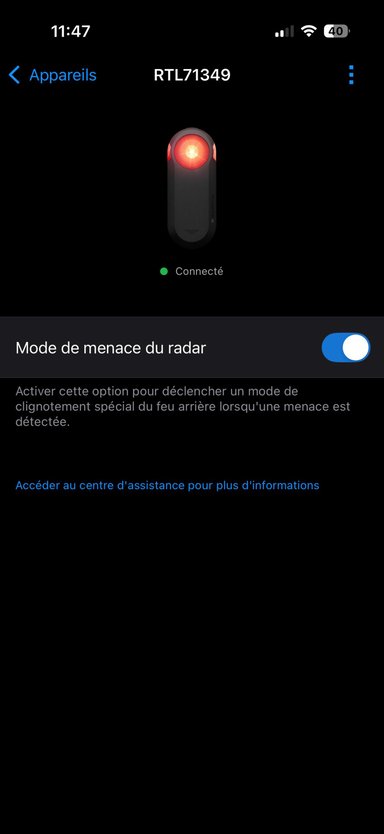 L’utilisation est d’une simplicité enfantine : un seul bouton permet d’allumer l’appareil et de basculer entre les différents modes d’éclairage (fixe — trois niveaux de puissance —, peloton, flash nuit et flash jour). La connexion se fait en quelques secondes via ANT+ ou Bluetooth avec un compteur GPS, une montre connectée ou directement sur un smartphone avec l’app Varia de Garmin.