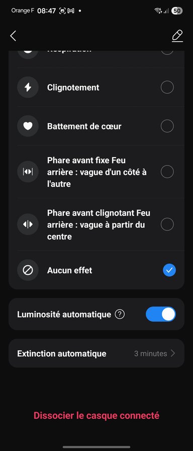 Le large bandeau avant s’illumine de blanc (plus ou moins clignotant selon le mode), tandis que le bandeau arrière s’allume en rouge ou orangé pour signaler les changements de direction, avec un effet lumineux directionnel. Deux modes de clignotement sont disponibles via l’application mobile. Principal regret : aucune LED avant ne signale les clignotants, invisibles pour les conducteurs venant en face.