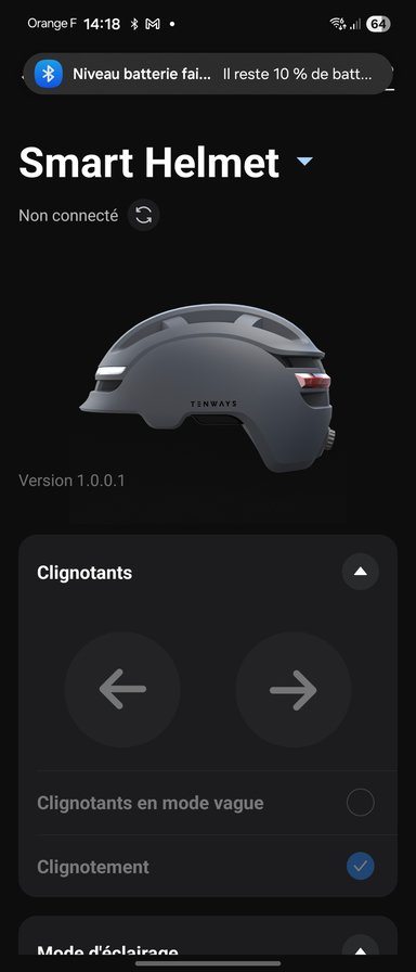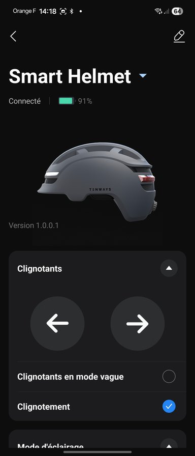 La télécommande fonctionne avec une pile bouton (autonomie non testée), tandis que le casque offre entre 4 et 6 heures d’usage selon le volume et l’éclairage. Nous avons noté un petit bug d’affichage de batterie faible sur le smartphone, alors que l’application Tenways indiquait bien 91 % restants.