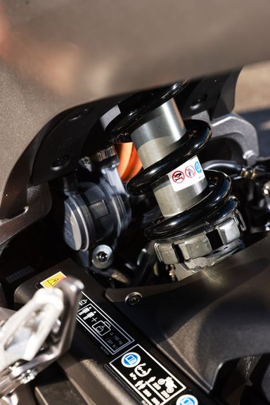 Suffisamment rare pour être signalé, les ingénieurs Honda nous ont expliqué que les éléments structurants, le bâti arrière, le monobras et le noyau avant procurent une flexibilité similaire aux modèles thermiques. Le but ? Garantir une sensation de conduite fidèle aux motos thermiques de la marque. C’est constaté : la machine se guide au doigt et à l’œil, se serre facilement entre les genoux tant elle est fine. Dans les grandes courbes des autoroutes allemandes, on regrette seulement de ne pas pouvoir passer plus vite que les 129 km/h (132 km/h compteur en descente).