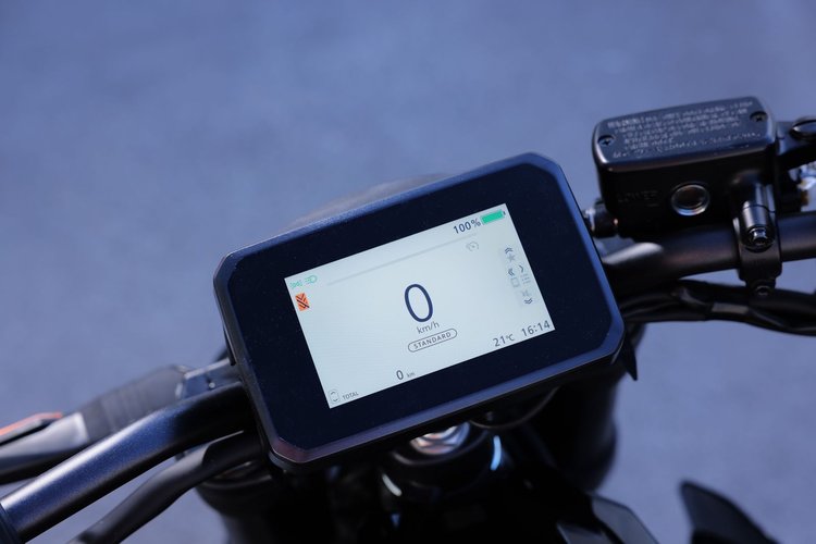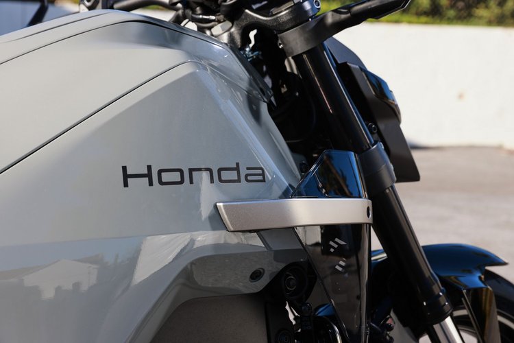 Là où Honda a pu faire des économies, c’est sur les commodos et l’instrumentation. Des éléments qu’on retrouve sur d’autres modèles de la gamme, et qui sont un peu « posés » là. Avec un écran TFT de 5 pouces, pas de CarPay ni d’Android Auto, mais le système maison Honda RoadSync avec lequel on peut coupler son téléphone. Au moins, on a une moto électrique simple et efficace. D’ailleurs, on allume la moto via un bouton sur le flanc gauche, tandis qu’on pivote l’anneau qui l’entoure pour l’éteindre. Plutôt pratique, même s’il est placé un peu bas.