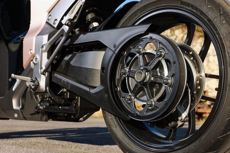Cette machine n’échappe pas à la règle de l’électrique : beaucoup de pêche au démarrage, et une courbe de couple qui baisse à partir de 3 800 tr/min. On a donc un peu moins de reprises tout en haut, et c’est normal. Mais elle se distingue tout de même par une démultiplication entre le moteur et le pignon de courroie en coupe hélicoïdale, ce qui rend le tout plus silencieux et plus progressif dans la transmission du couple. Associée à une courroie, la machine est vraiment agréable pour le pilote, et un discret « wizz » accompagne son passage pour les observateurs postés sur le trottoir.