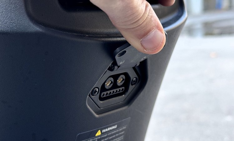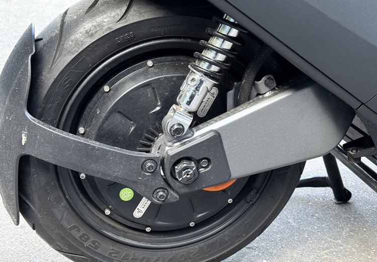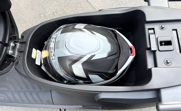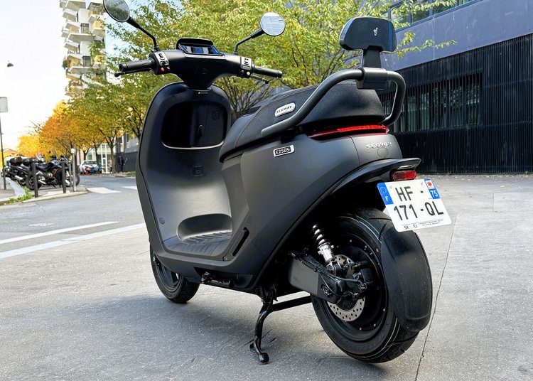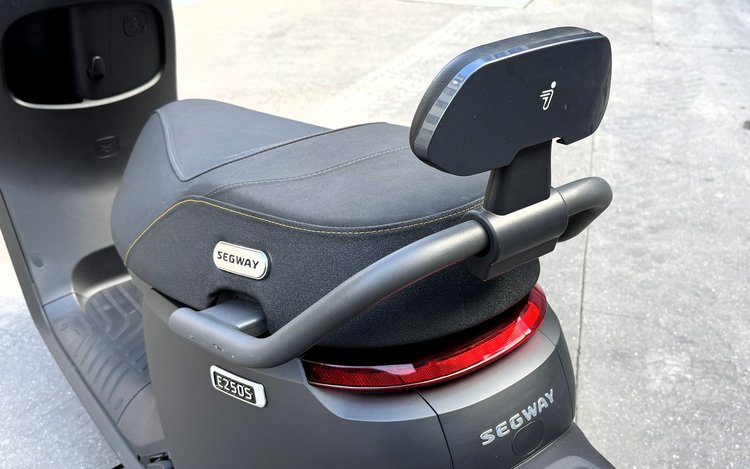 L’E250S reprend la philosophie des modèles Segway : un moteur intégré dans la roue arrière, silencieux et réactif. En pic, il délivre 7,5 kW, soit l’équivalent d’une dizaine de chevaux. Ce moteur est alimenté par 2 batteries de 2 kWh chacune (soit 4 kWh). Celles-ci sont parfaitement intégrées dans le plancher, ce qui permet de libérer un bel espace sous la selle de 34 litres pour accueillir un casque intégral et le chargeur externe. Amovibles, ces batteries disposent d’une poignée pour faciliter la manipulation, même si les 13 kg par pack se feront ressentir (elles peuvent aussi être directement chargées sur le scooter via un connecteur dédié). Temps de charge ? Environ 2 heures par batterie via le chargeur 1 kW fourni.
