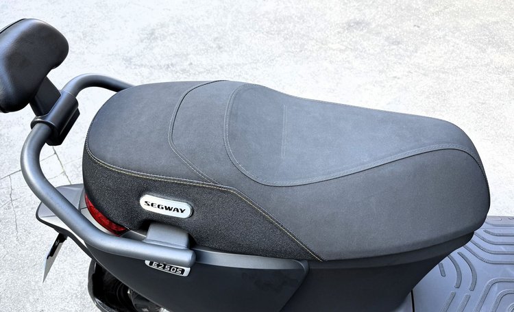 Le Segway E250S soigne également sa partie-cycle. Le cadre en acier abrite une petite fourche télescopique à l’avant et deux amortisseurs réglables en précontrainte à l’arrière. Les roues de 12 pouces accueillent de grands disques : 220 mm à l’avant, 200 mm à l’arrière, le tout couplé à un ABS et un antipatinage.