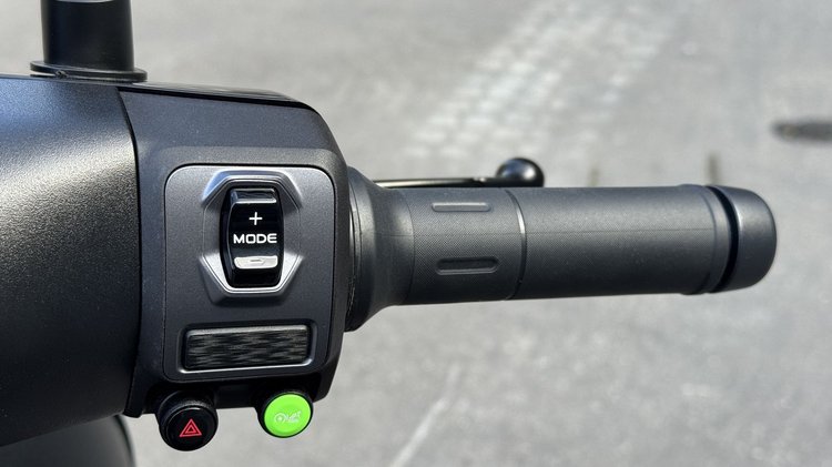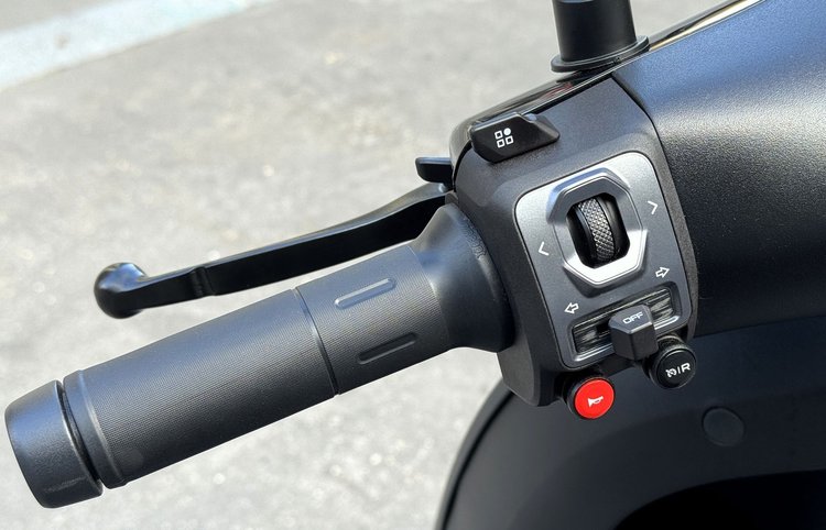 Avec une hauteur de 78 cm, la selle permet à un gabarit moyen de poser les pieds à plat. Les 121 kilos du scooter (avec deux batteries) se laissent manipuler sans contrainte, notamment grâce à la présence d’une marche arrière très pratique en manœuvre.