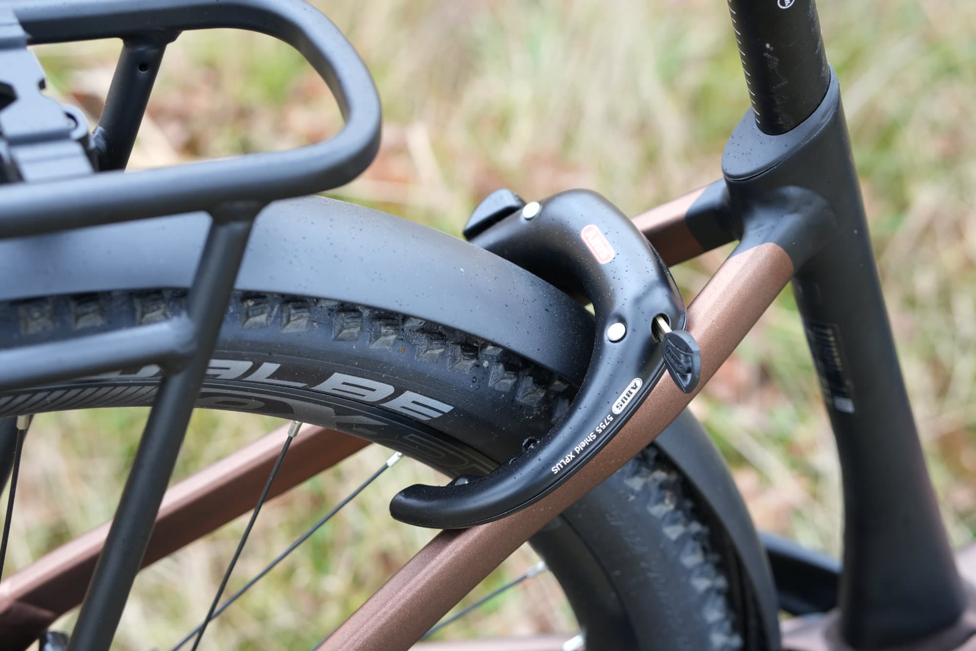 Ses roues dignes d’un VTT n’empêchent pas l’AnyTour X E+ de disposer de garde-boue assez couvrants pour préserver le pilote comme son équipement des éclaboussures. Celui de la roue avant aurait pu être prolongé avec une bavette pour épargner la pointe des chaussures, mais le risque de le voir frotter contre le moindre obstacle sur les sentiers était sans doute trop grand. De même, le carter de chaîne est assez court, mais suffit à protéger les bas de pantalons du gras de la chaîne.