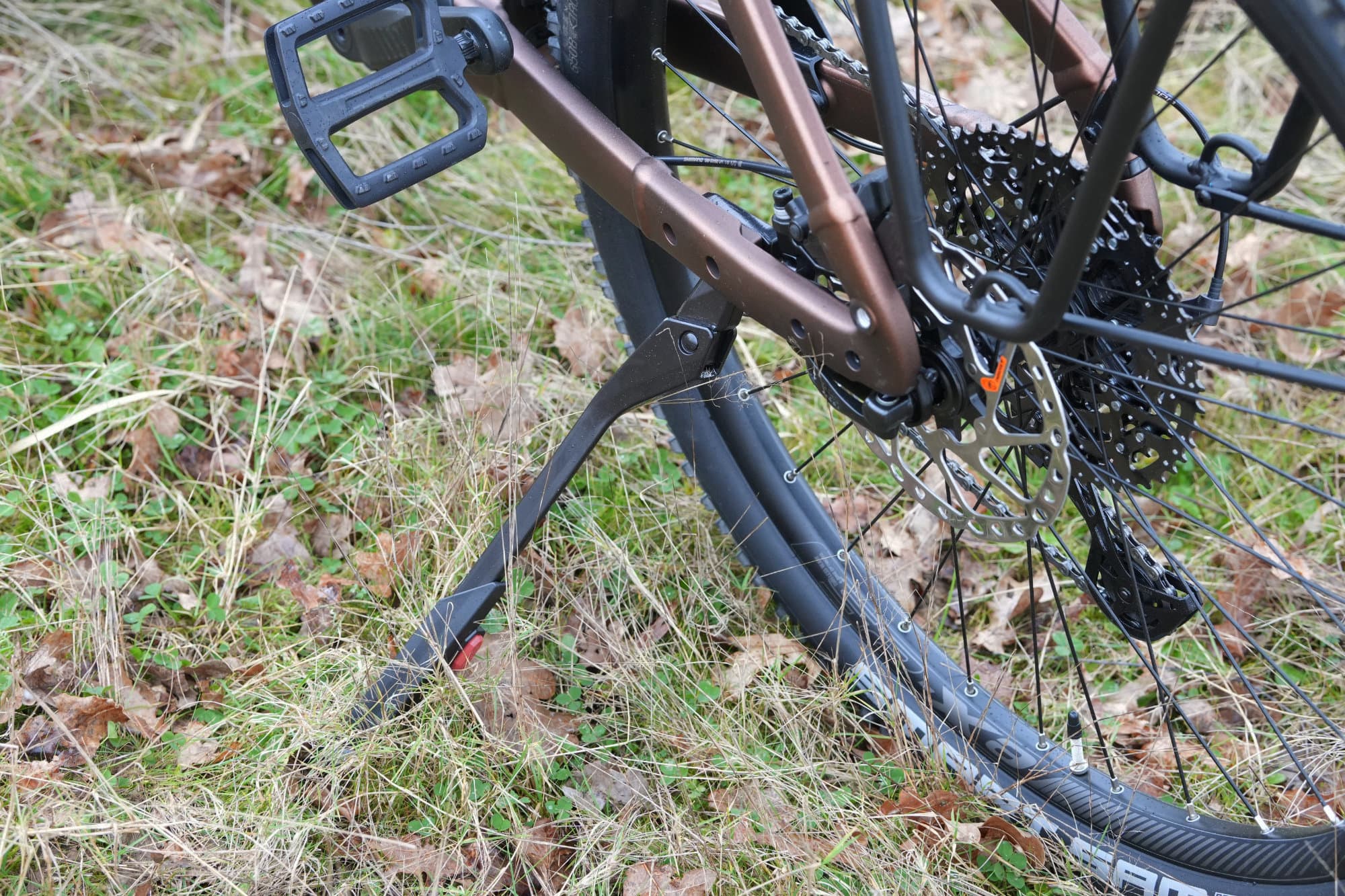 La peinture métallisée de couleur bronze est également du plus bel effet et paraît résistante. L’assemblage est tout aussi soigné. Seul le cache de la batterie en plastique noir mat dénote un peu, d’autant qu’il occupe une bonne partie de la face supérieure du tube diagonal. Il est toutefois assorti aux autres composants du vélo, pour un ensemble harmonieux. On regrette que ce cache ne soit pas sécurisé ; seule la batterie l’est par une serrure à clé.