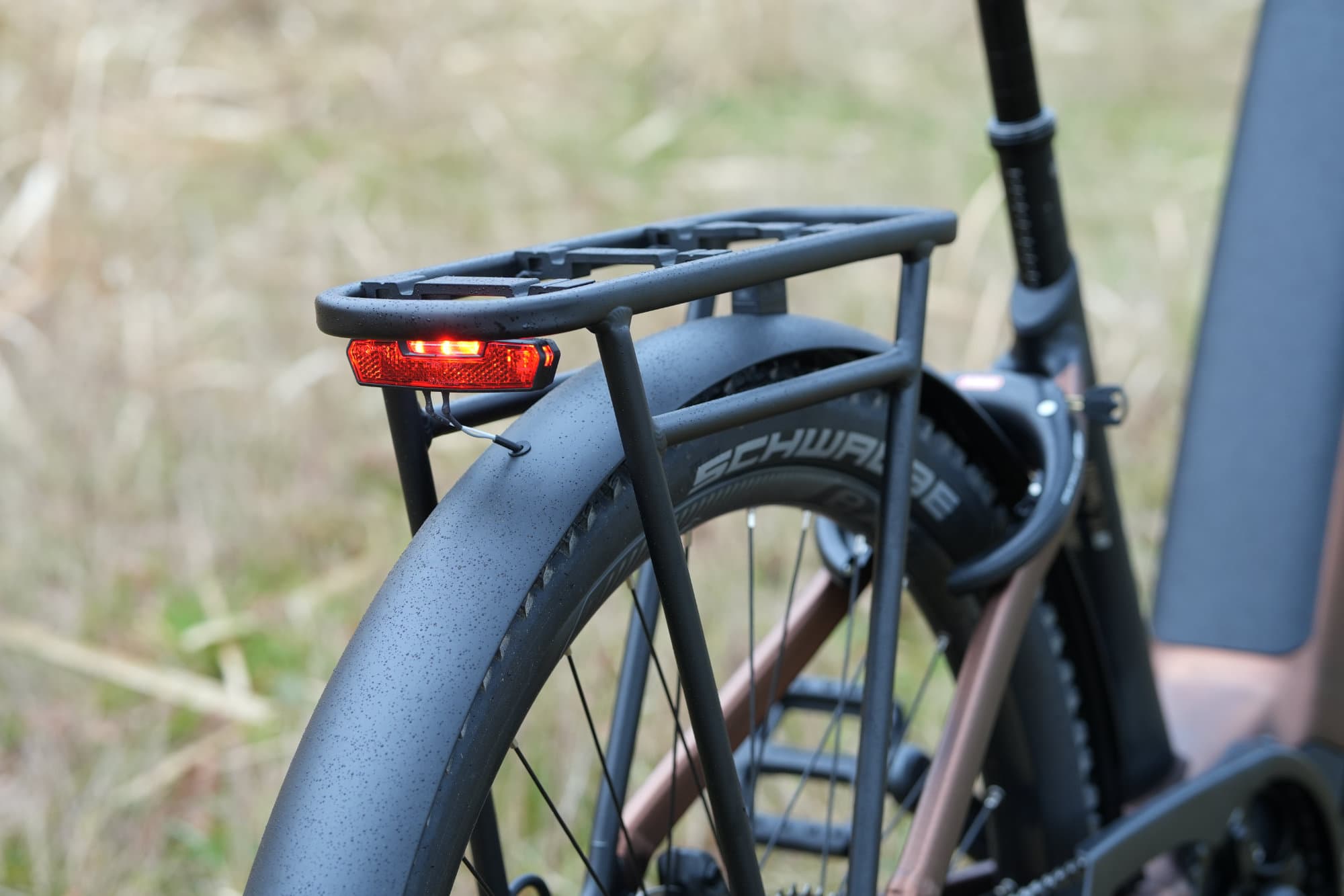Relativement discret, le porte-bagages arrière intègre des fixations MIK-HD pour installer facilement sacoches ou siège enfant. Il supporte jusqu’à 27 kg. Un feu arrière Axa Juno alimenté par la batterie y est fixé. Celui-ci agit également comme un feu stop au freinage.