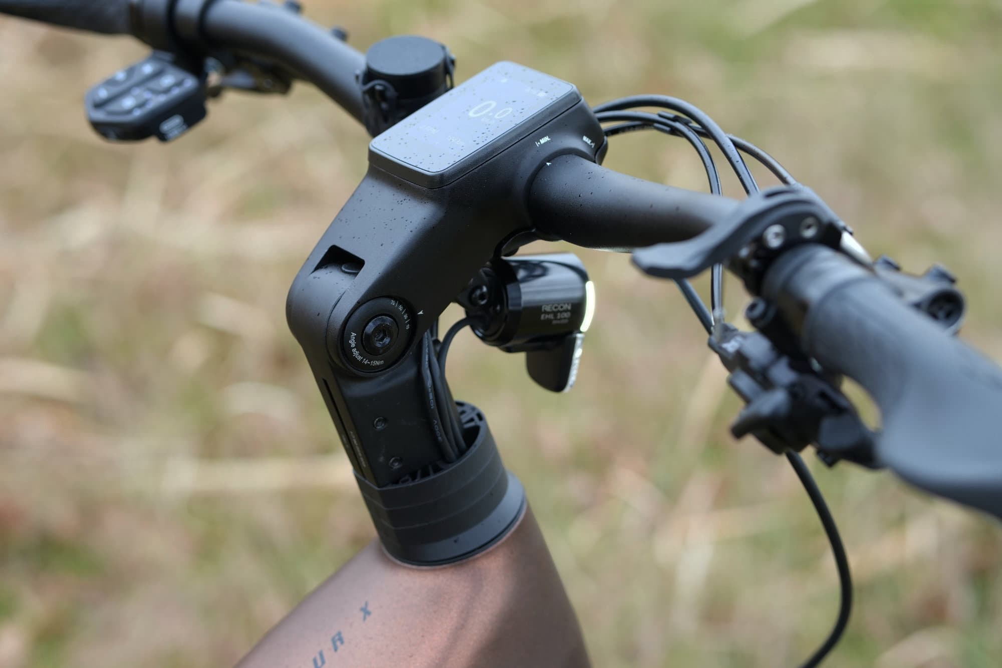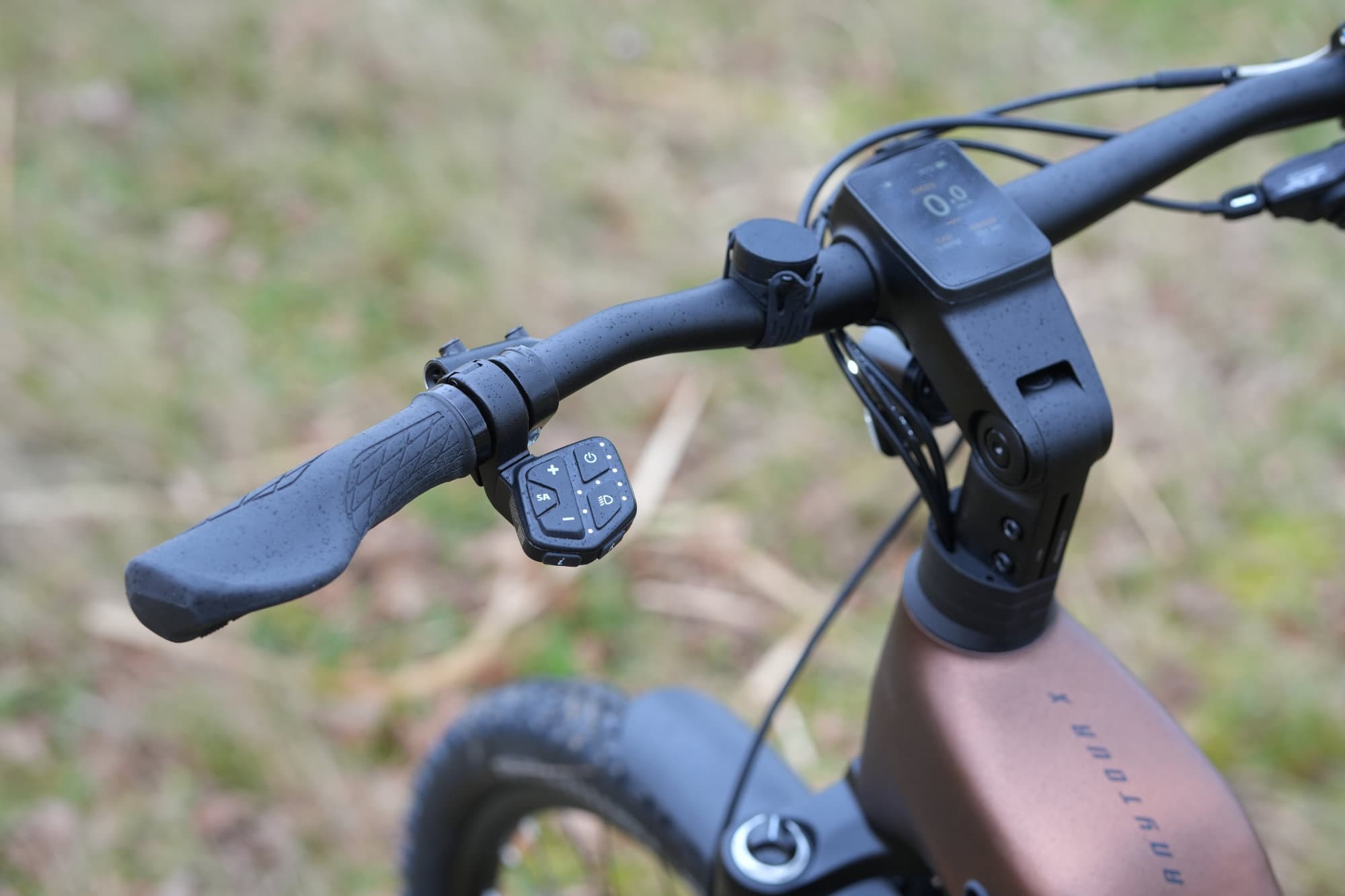 Outre la hauteur de selle, l’angle de la potence est aussi réglable pour obtenir une position de conduite plus ou moins droite. L’AnyTour X E+1 étant typé « trekking », son cintre n’est que très légèrement courbé, pour maximiser l’efficacité de pédalage. Il offre néanmoins une petite rehausse qui ajoute au confort. La position de conduite est ainsi globalement confortable et l’on peut compter sur des poignées ergonomiques pour réduire la fatigue sur de longs trajets.