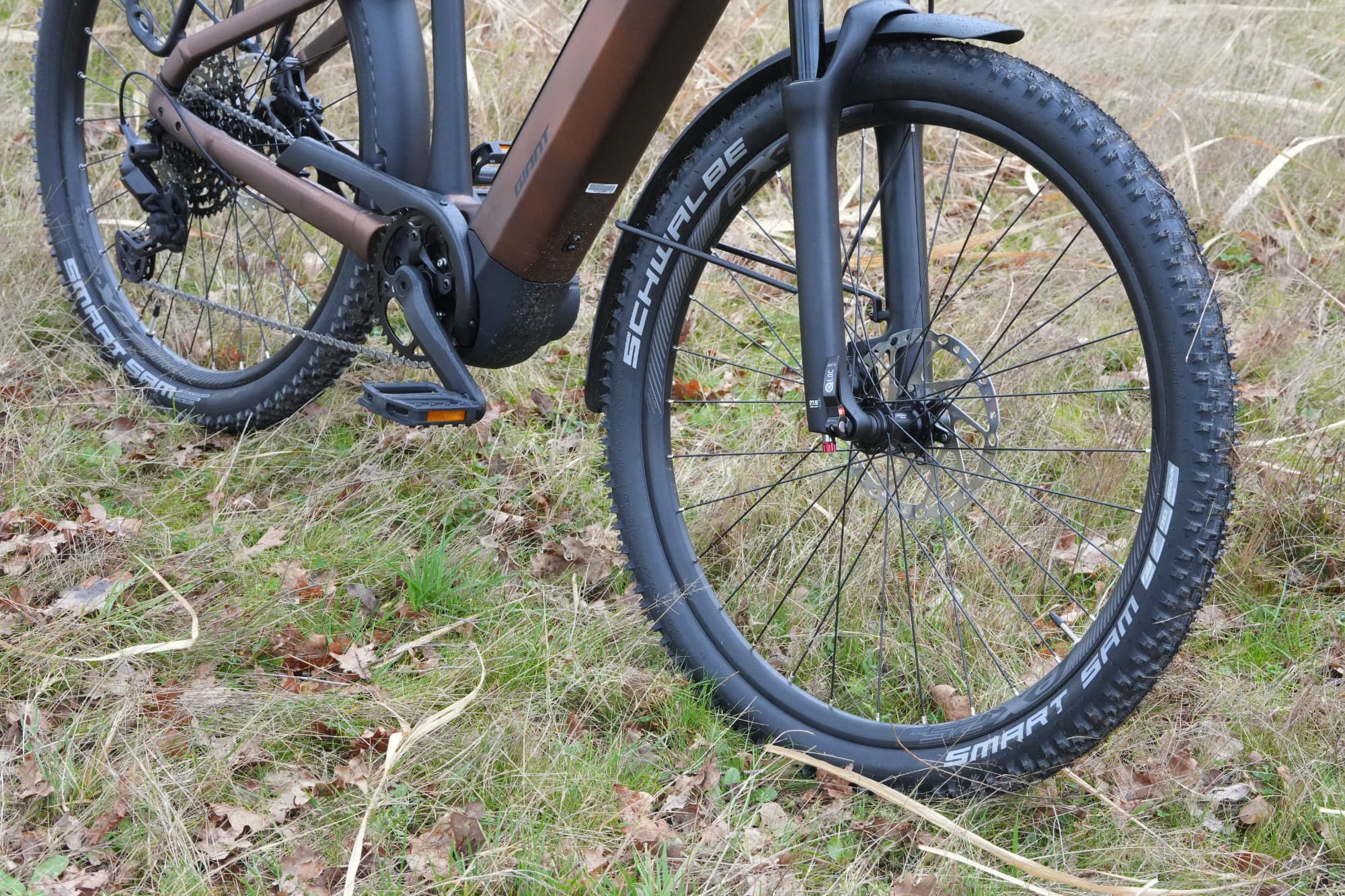 Sur un vélo, les pneus contribuent aussi beaucoup au confort. Avec ses larges pneus Schwalbe Smart Sam Plus de 2,25” de section issus du VTT, l’AnyTour X E+1 est particulièrement bien doté. Leur volume d’air assure une bonne absorption des irrégularités du revêtement et leur compatibilité tubeless permet d’abaisser encore leur pression en se passant de chambre à air, pour un gain de confort autant que d’adhérence. De quoi augmenter la résistance aux crevaisons également, sachant qu’ils intègrent aussi une bande anticrevaison de 3 mm d’épaisseur.