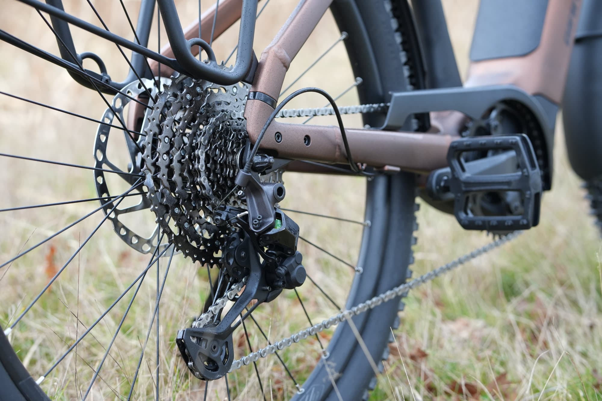 Le plaisir de rouler ne passe toutefois pas seulement par l’assistance. La transmission joue un rôle très important et l’on peut ici se réjouir de disposer d’une des meilleures du moment. Le groupe Shimano Deore offre, en effet, des passages de vitesses précis et rapides, pour optimiser notre cadence de pédalage, et ainsi limiter le besoin d’assistance électrique. La large plage de développement offerte par la cassette 11-50 associée au plateau de 42 dents a de quoi réjouir tous ceux qui aiment pédaler et ne pas se laisser porter par le moteur.