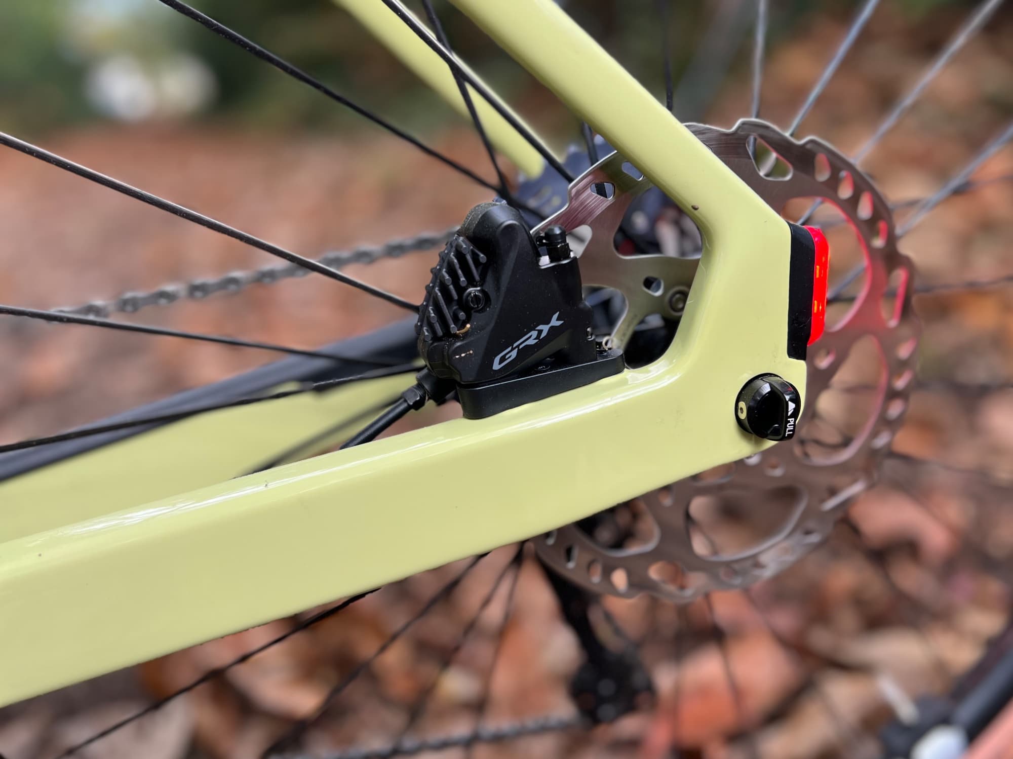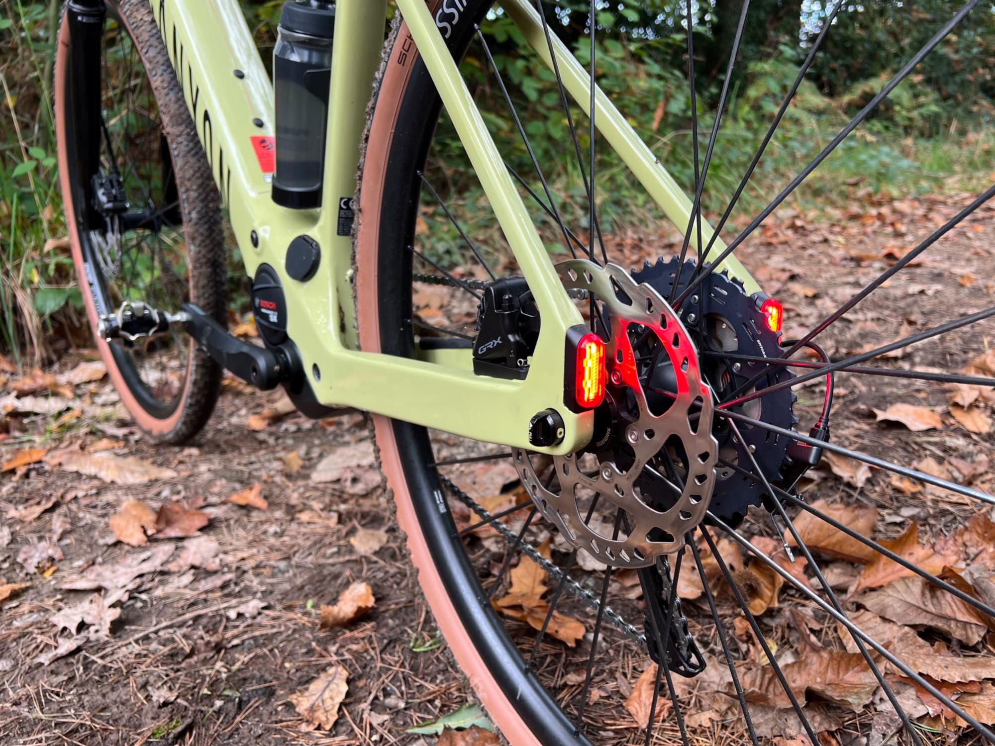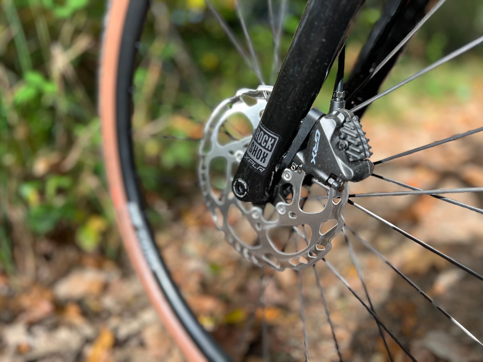 Plus lourd qu’un gravel musculaire, le gravel électrique doit pouvoir compter sur de bons freins pour s’arrêter promptement. On peut compter sur un ensemble Shimano RX600 pour ce faire, avec des disques RT70 de 180 mm. Le vélo et son pilote (de 84 kg environ tout équipé) lancés à 25 km/h s’arrêtent en moins de 3 m en freinage appuyé sur route sèche et plate.