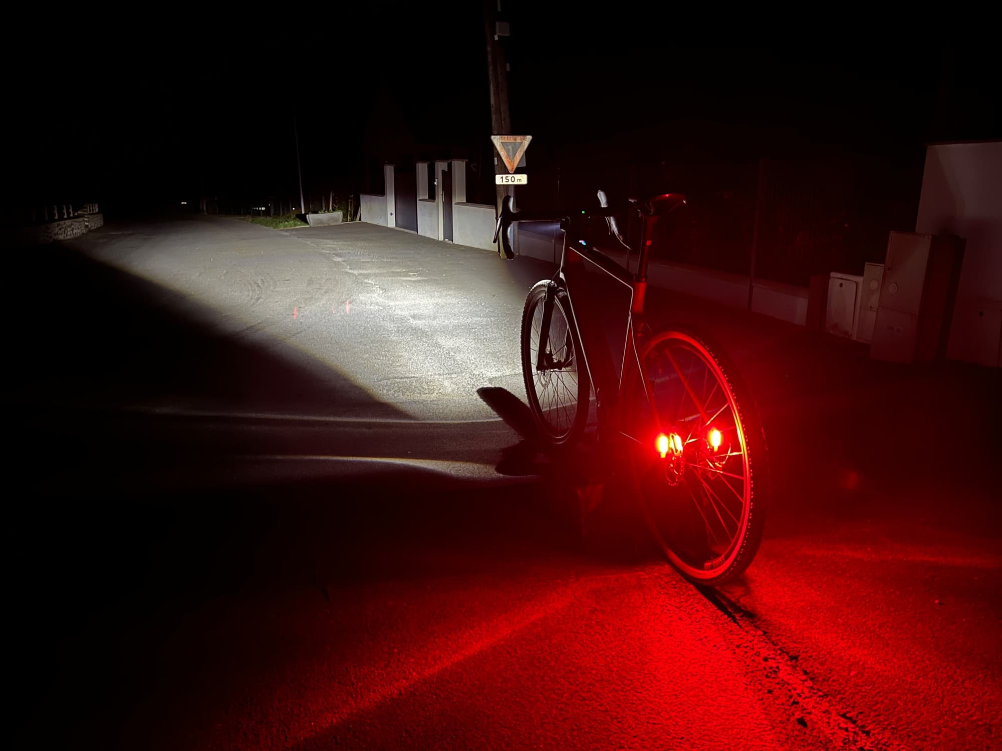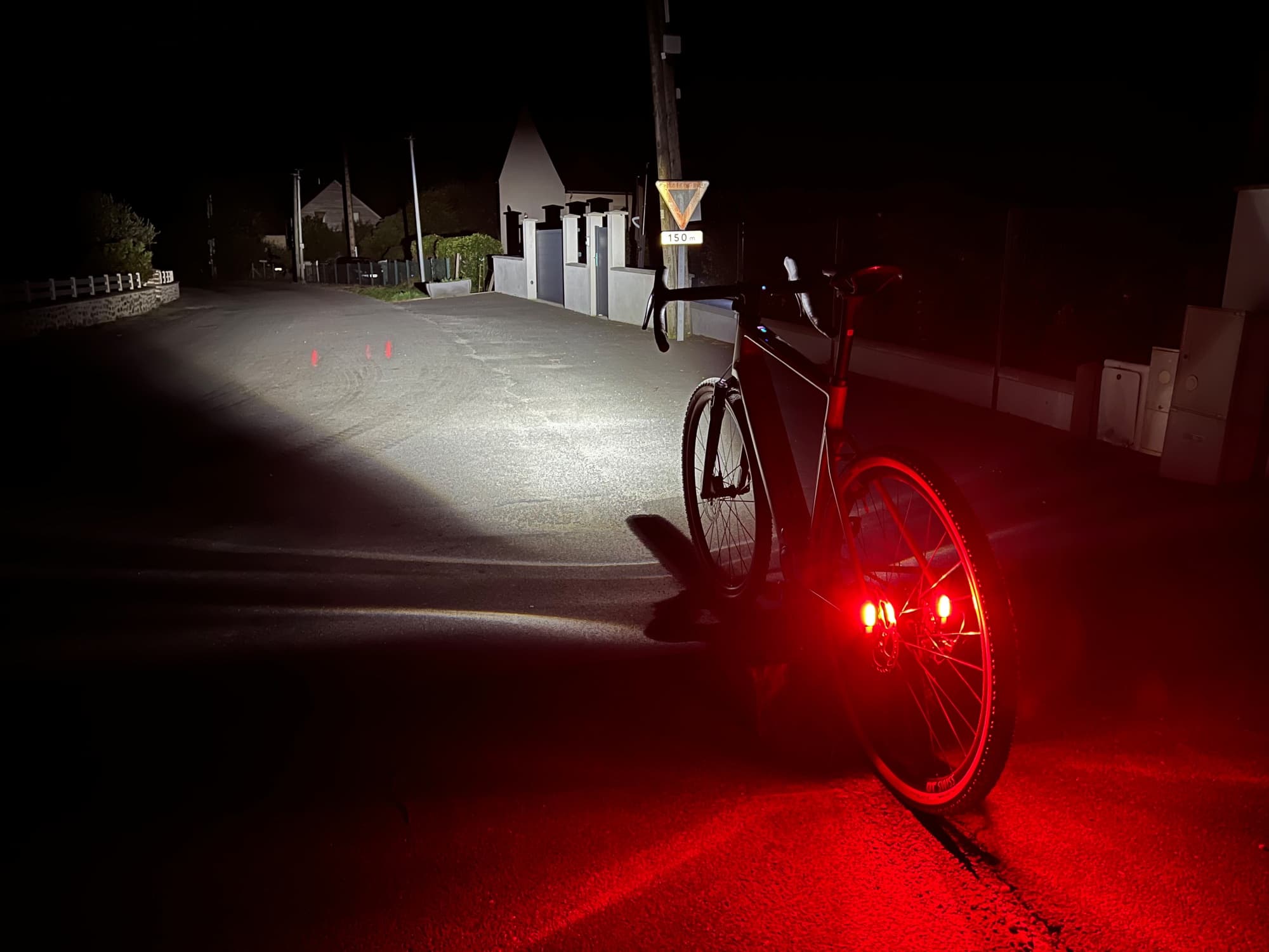 L’éclairage arrière n’est pas en reste, avec deux feux C14 fixés au bout de chaque base. En plus d’offrir une belle signature lumineuse au vélo, ces feux éclairent très bien et offrent une bonne visibilité au cycliste. En raison de leur position très basse cependant, on n’hésitera pas à les compléter par un feu au niveau de la tige de selle et/ou derrière le casque si l’on roule en agglomération, pour être mieux vu des automobilistes à courte distance.