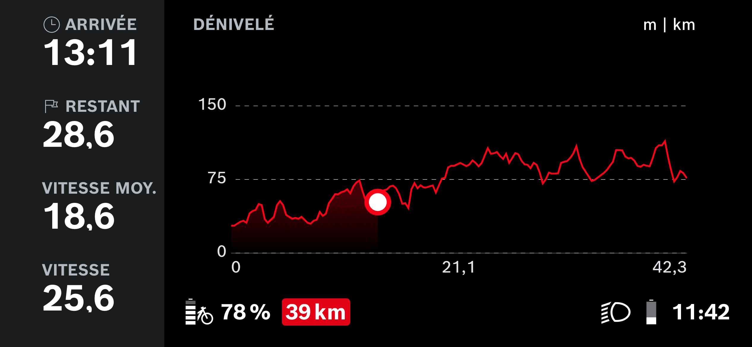 Pour notre essai, nous avons effectué un parcours empruntant des pistes et voies cyclables variées, en ville et en campagne, par temps frais (10 °C environ). En utilisant le mode turbo et en tâchant de conserver une cadence de pédalage modérée (70 tr/min environ), nous avons pu parcourir très exactement 51 km avec 420 m de dénivelé positif et une charge totale de 85 kg environ (cycliste, équipement et antivols compris). L’assistance se coupe ensuite pour conserver un peu d’énergie pour l’ordinateur de bord et l’éclairage.