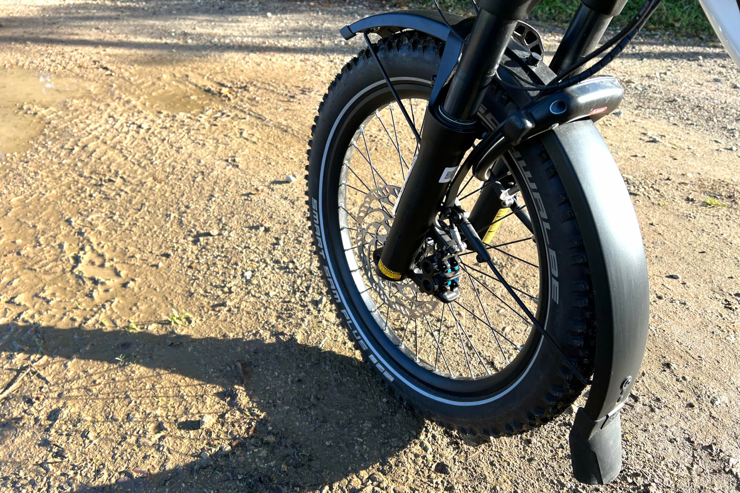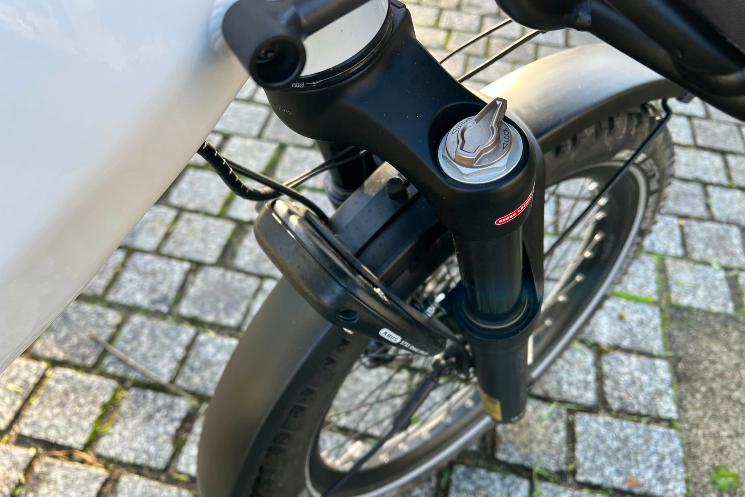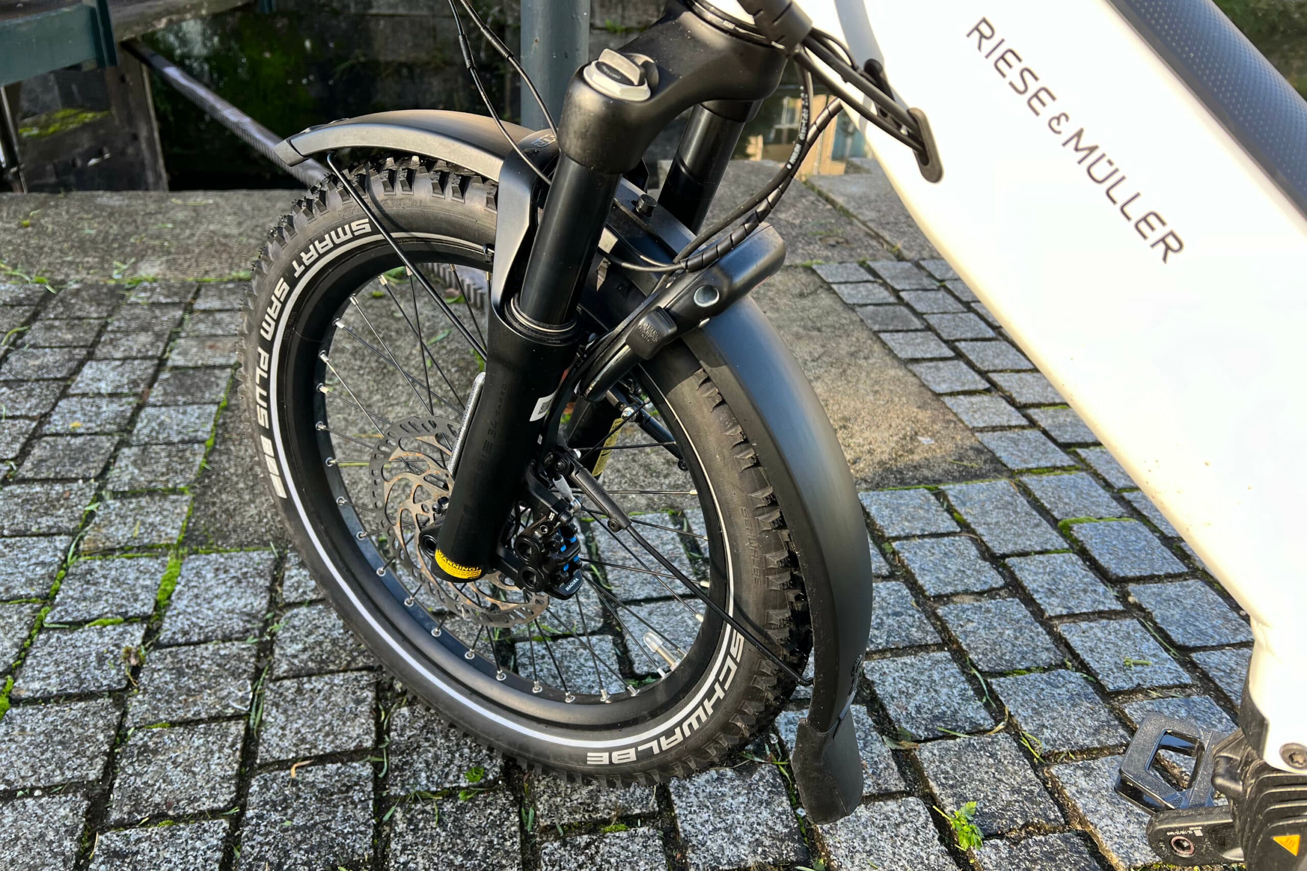 Étrangement, la tige de selle n’est pas non plus suspendue, contrairement à celle du R&M Multicharger. Les larges pneus Schwalbe Smart Sam Plus de 2,35” (ETRTO 60-406) assurent heureusement un très bon travail de filtration et nous avons été agréablement surpris par le confort offert par ce Multitinker.