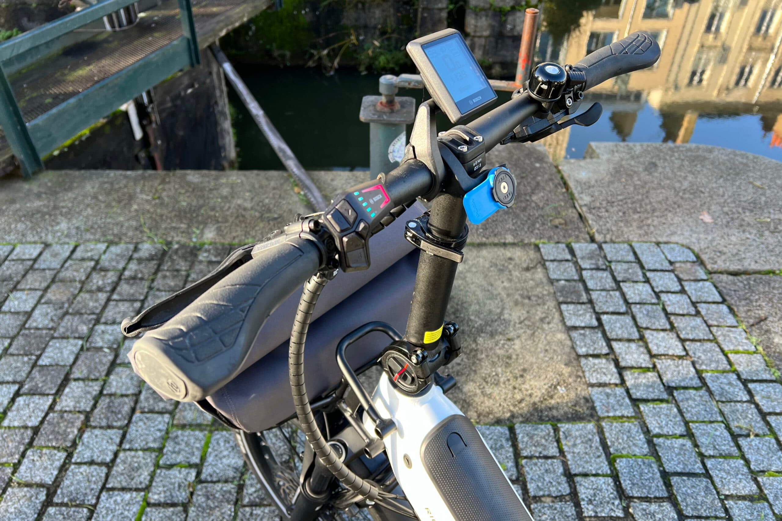 L’assistance se contrôle via la commande Bosch Led Remote, associée à un afficheur Intuvia 100 amovible. L’écran LCD monochrome 2,5” de ce dernier n’est pas ce qu’il y a de plus sexy, mais il s’avère bien lisible et profite d’un rétroéclairage bleu lorsque la nuit vient à tomber. Il affiche en tout cas les informations essentielles telles que la vitesse instantanée, les vitesses maximale et moyenne, l’odomètre, la distance du parcours, l’estimation d’autonomie restante en kilomètres ainsi que l’heure. Un afficheur à écran couleur Kiox 300, plus complet, est aussi disponible en option, si l’on souhaite encore plus d’informations et même l’affichage des directions à prendre lors d’un guidage depuis le smartphone — qui lui peut ainsi rester dans la poche.