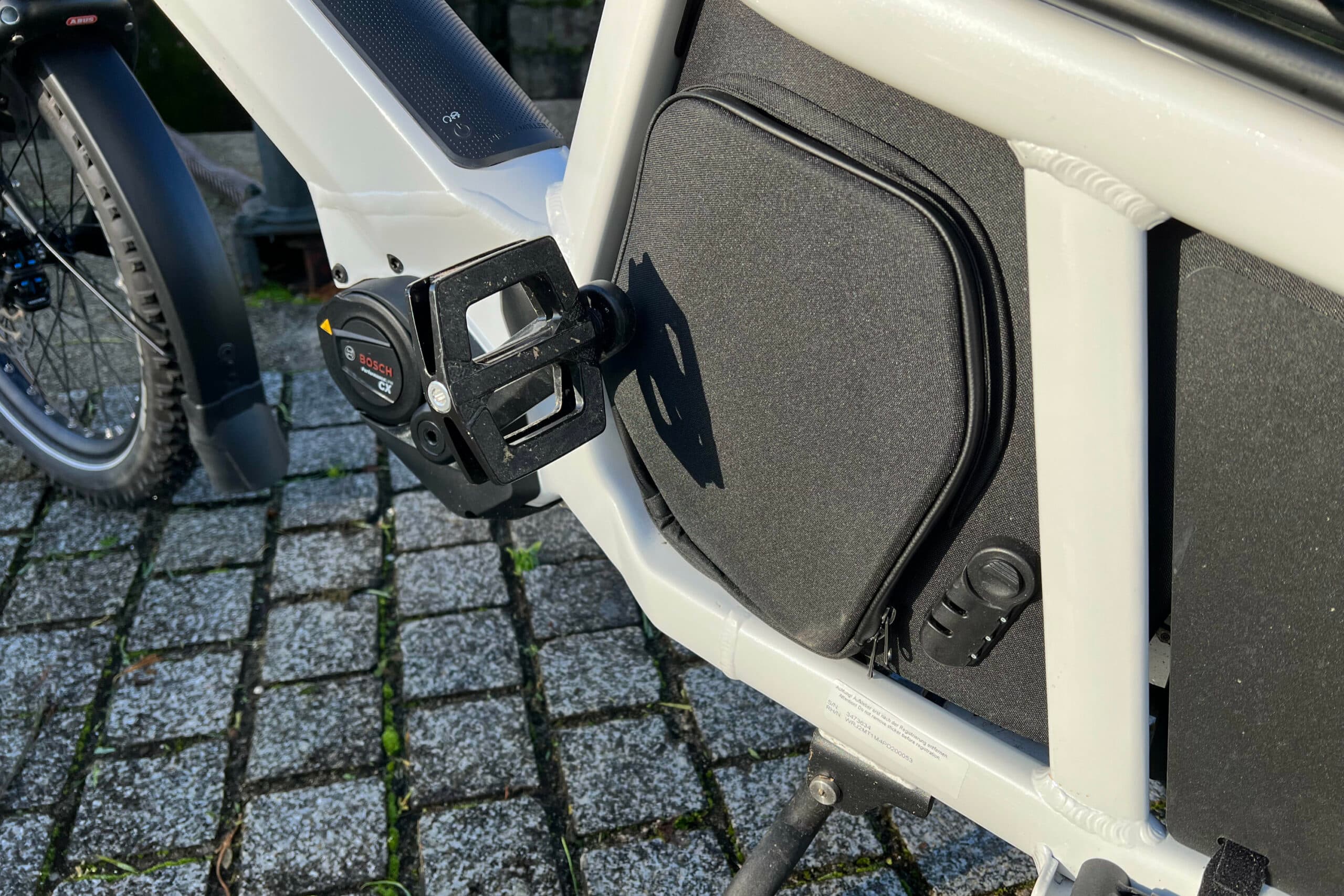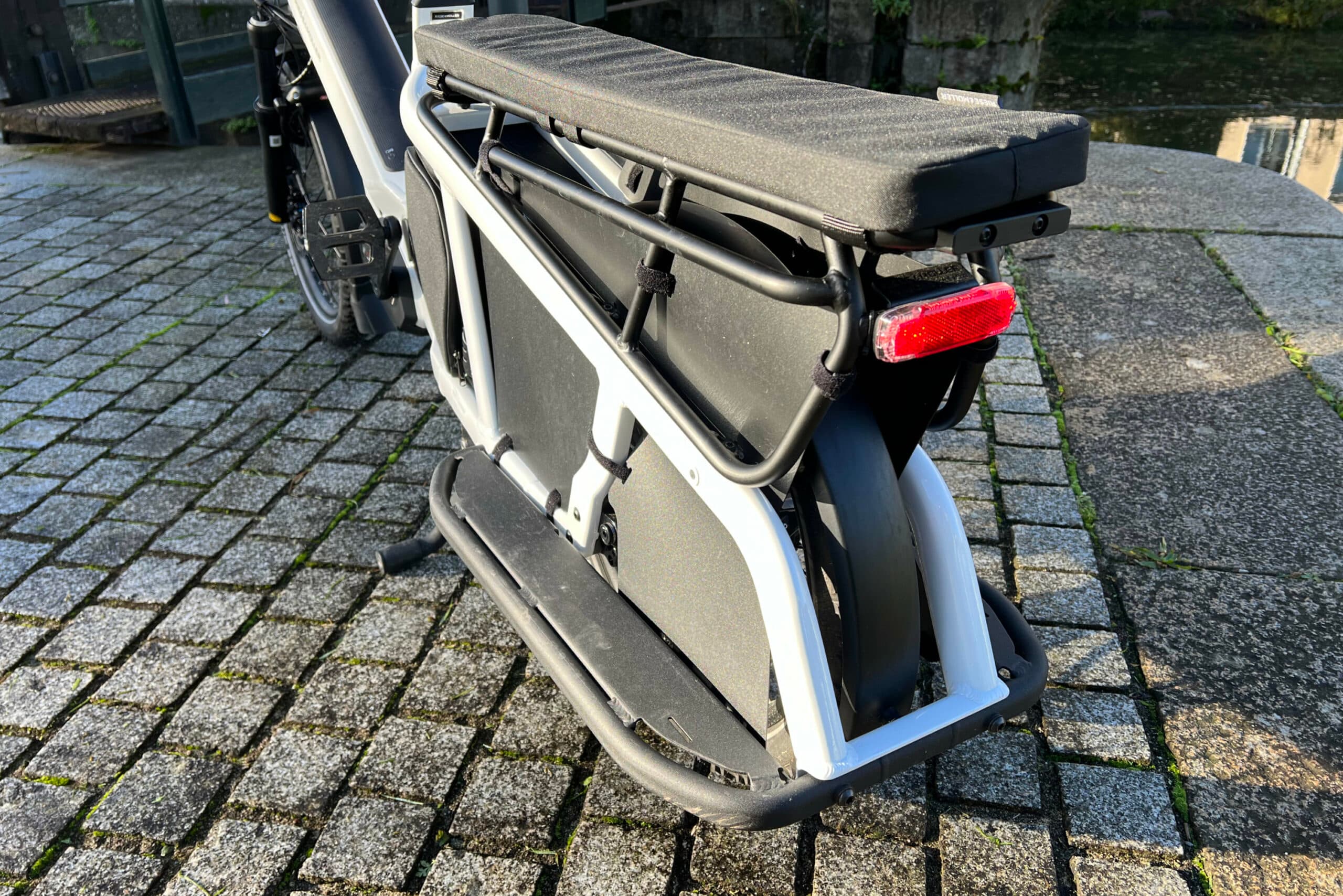 Joliment fixé sur les haubans du vélo, le long porte-bagages arrière peut être équipé d’assises en mousse pour le transport de deux enfants ou d’un adulte jusqu’à 65 kg. Les longs repose-pieds installés de série sont appréciables, mais l’installation des sacoches cargos optionnelles limite la place restante. Un arceau de sécurité peut également être ajouté pour les enfants de moins de 7 ans. Sans lui, il faudra se contenter de poignées à fixer sur la tige de selle. Dommage qu’une seconde paire de poignées ainsi qu’un dossier ne puissent être fixés sur le porte-bagages pour le second passager, lequel devra donc se tenir fermement à celui assis devant lui.