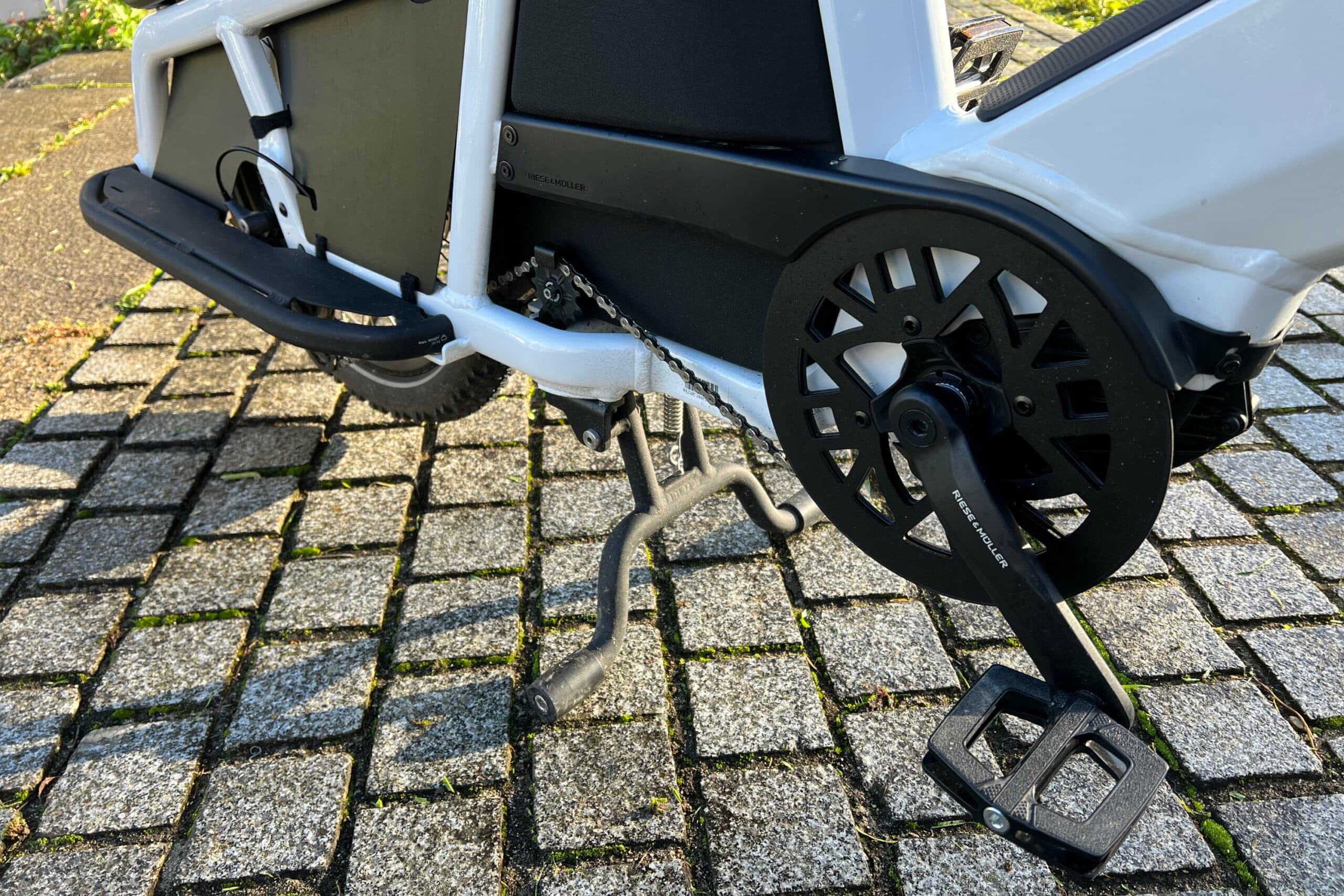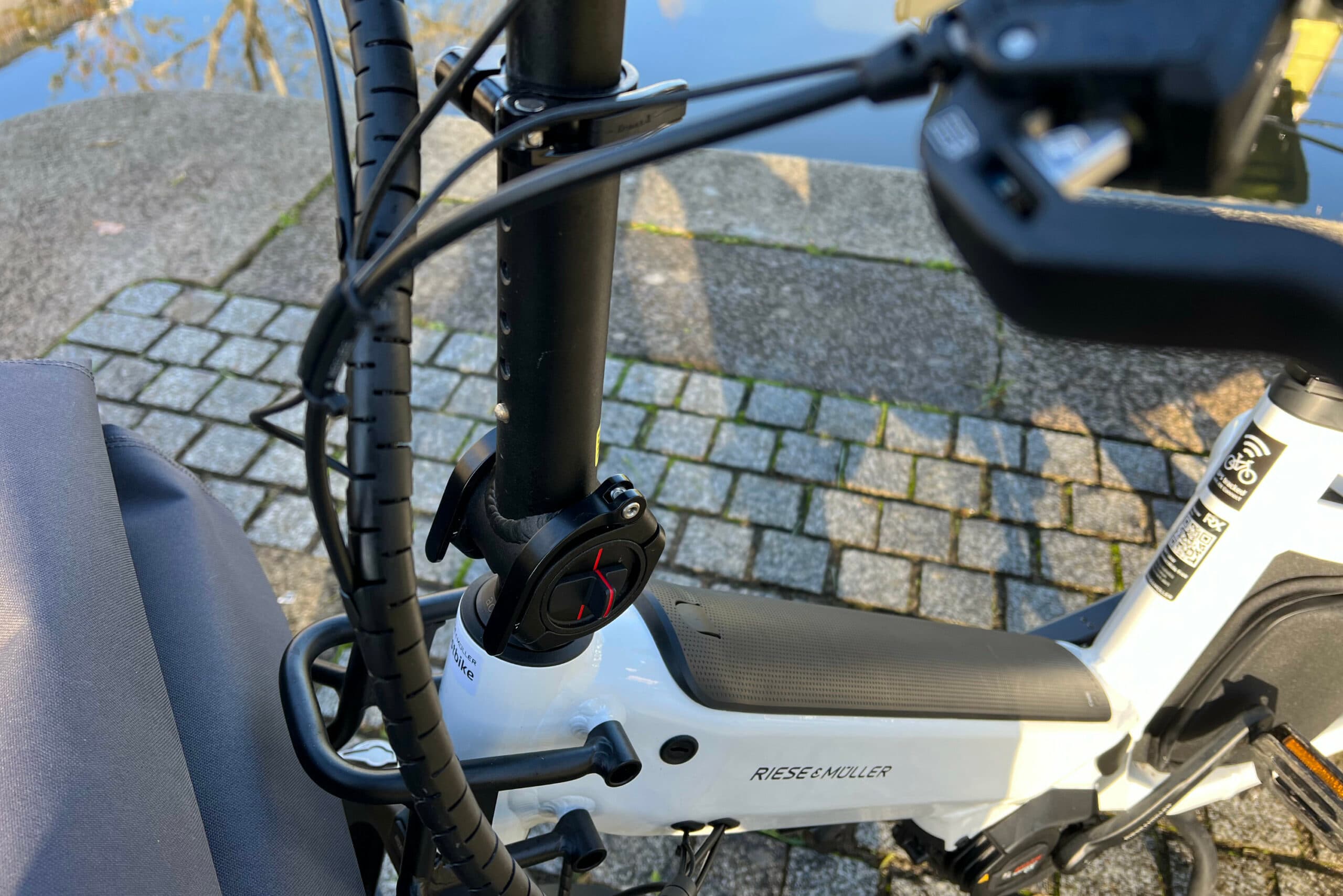 En revanche, ces accessoires sont tellement bien ajustés qu’ils rendent difficile le passage d’un antivol. On pourra éventuellement passer l’antivol par le porte-bagages, mais le vélo sera alors moins sécurisé, celui-ci n’étant pas soudé au cadre. Riese & Müller propose néanmoins une chaîne en option (50,90 €), prévue pour se fixer dans l’antivol de cadre. À associer à un bon U et au système d’alarme sonore du vélo pour s’éloigner de notre précieux l’esprit — un peu plus — tranquille.