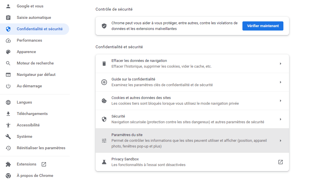 Dans la section Confidentialité et sécurité, cliquez sur Paramètres des sites, puis se rendre dans le menu Notifications (catégorie Autorisation).